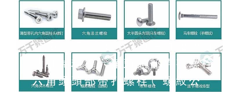 1.六角頭(hexagon head) 2.六角頭法蘭面(hexagon head with flange) 3.方頭(square head) 4.T形頭T head (hammer head)5.扁圓頭mushroom head(truss head) 6.圓柱頭(cheese head) 7.圓頭(round head)8.盤頭(pan head)9.